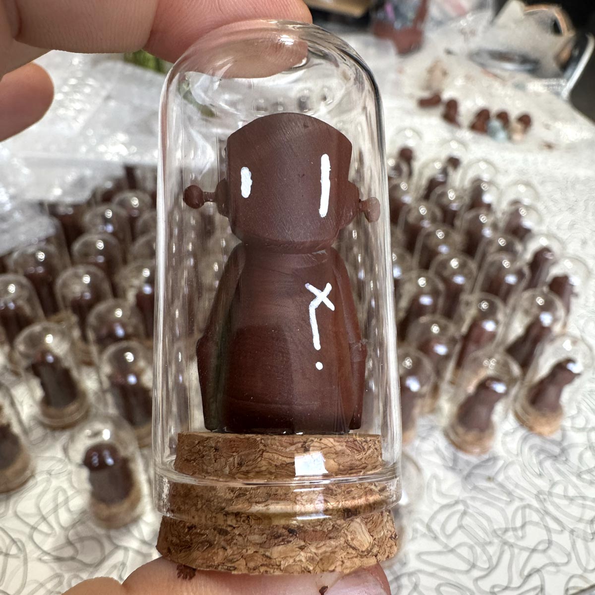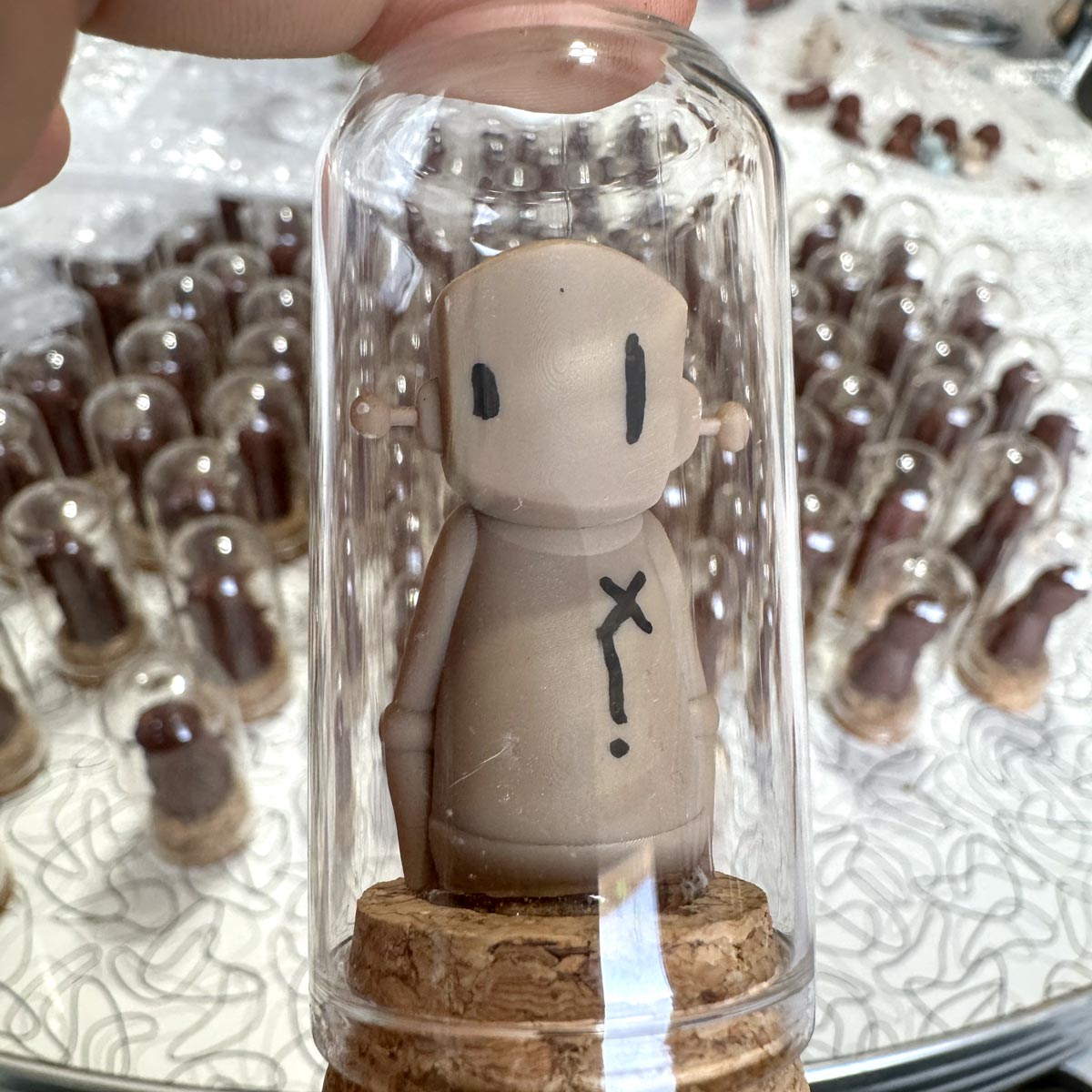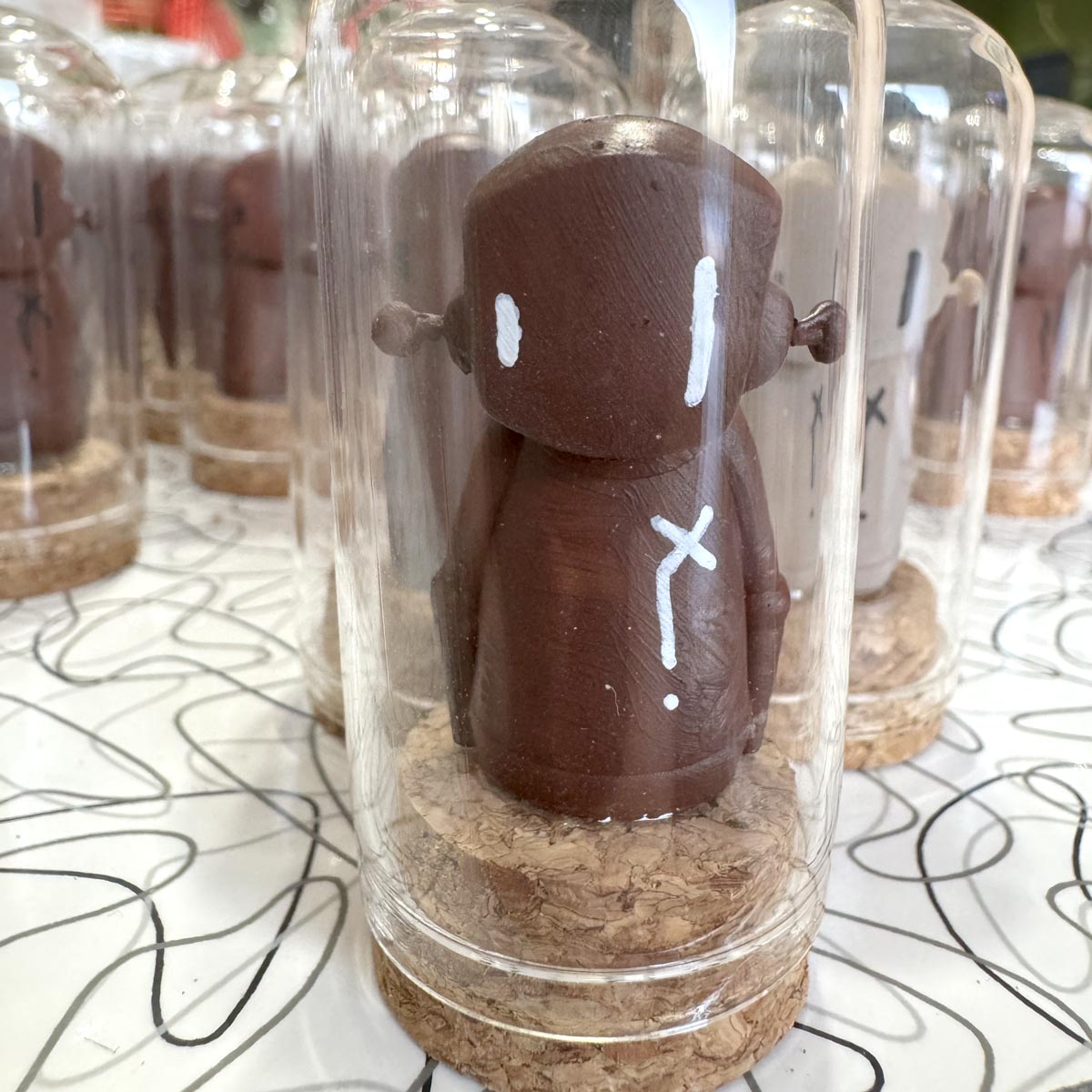 Every BeanBot comes sealed under a glass dome with a cork base, like a specimen from another world. A small character with a lot of presence.